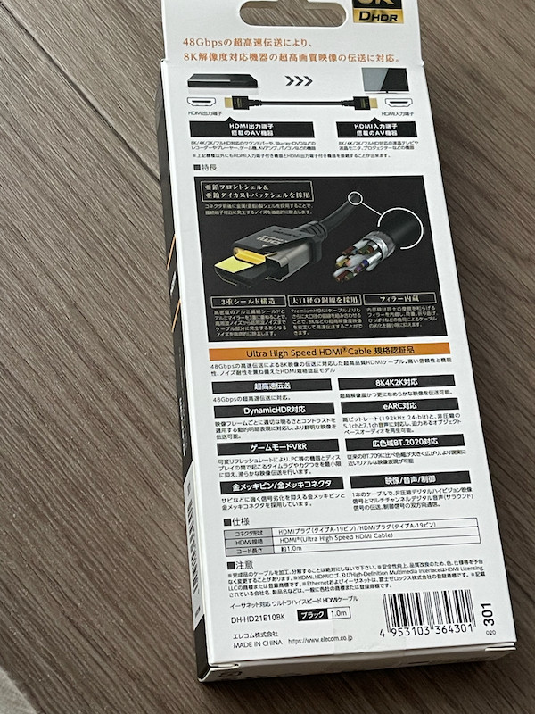 ネットを検索するとケーブルを変えたら直ったという書き込みを見て早速HDMIケーブルをヨドバシカメラに買いに行きます。HDMIケーブルはApple TVとテレにを繋ぎ映像と音声を伝送できるケーブルです。接続は簡単ですが色々な規格がありどれを買って良いのかの区別がつきません。今まで使っていたのは「ヤマダセレクト HIGH スピードケーブルです。